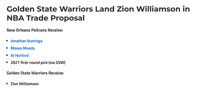 Speed Esports-勇士成锡安头号热门下家!美记晒4换1交易方案:将库明加送往鹈鹕