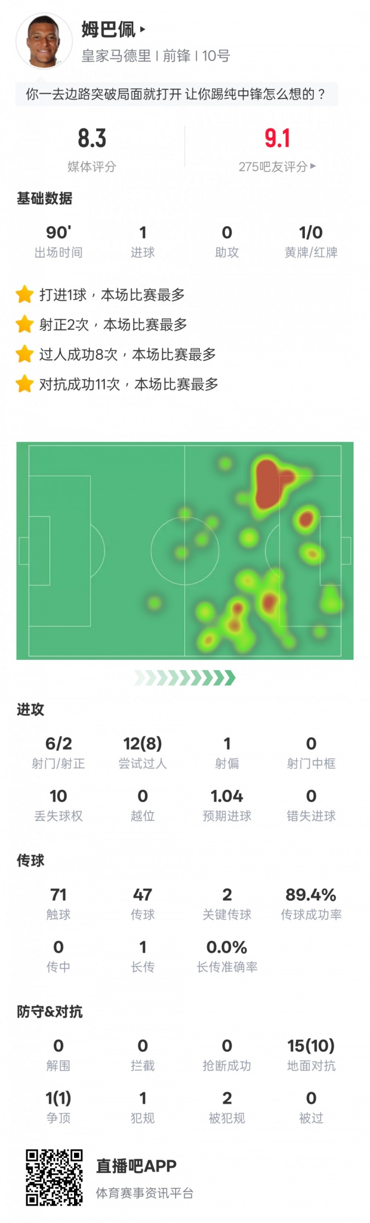 8月20日讯 2025-26赛季西甲首轮,皇马1-0战胜奥萨苏纳,姆巴佩首发出战,造点+点射,另外还有8次过人成功,评分8.3。